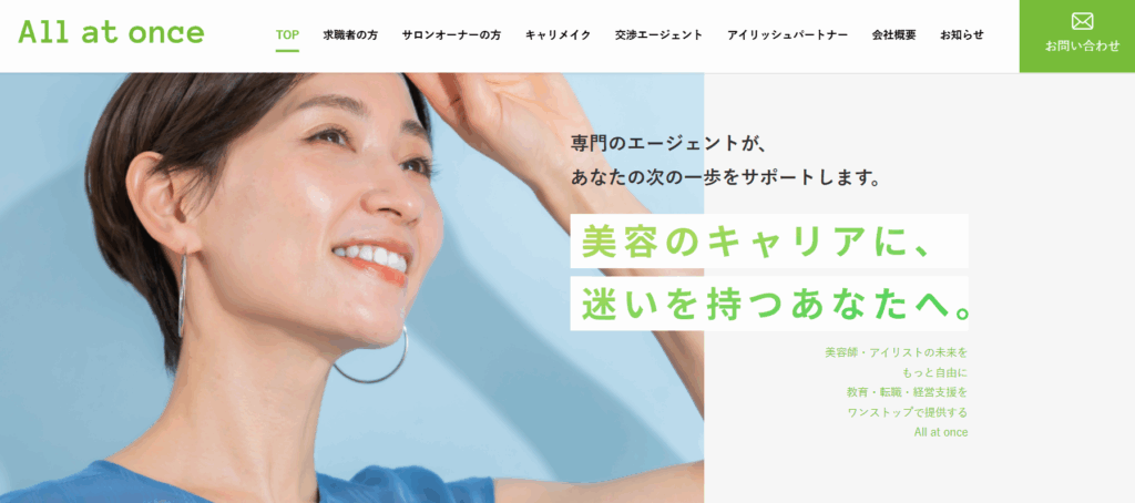 ここで登場するのが、All at onceのような“美容師・アイリスト特化”のエージェント。彼らは「美容師としての技術支援」だけでなく、「働き方・キャリアパス・環境」という側面も一緒に考えてくれます。公式サイトには “教育・転職・経営支援をワンストップで提供” と掲げられています。 (美容系の転職サポートなら株式会社All at once –)